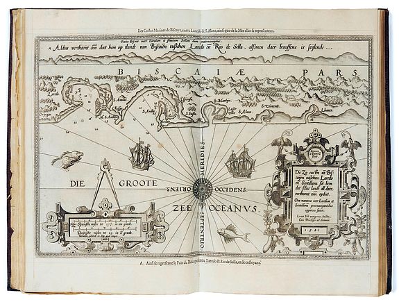 A superb and famous work of maritime navigation, it was published for the first time in Dutch in 1583 under the title Spieghel der Zeevaerdt. The atlas was very innovative because it combined nautical charts with coastal profiles, and its success was immediate and considerable. Waghenaer systematically combines the coastal chart with a matching coastal profile on a uniform scale of 1:400.000. On all the charts, we find sea monsters, and there are detailed drawings of ships. After 1585, some new editions of Van Waghenaer's Sea Atlas were published in Latin, German, English, and French. Initially, the charts had Dutch titles and profile texts. At a later stage, the titles were engraved again and a Latin title was added.Each title page bears a printed paper slip masking the engraved title cartouche of the 1583 edition. A very fine regulated example with the arms of the Martin de La Roque family, some members of which held positions in Bordeaux during the time of Michel de Montaigne. Chart 1 is supplied from another example. Very dark impressions.