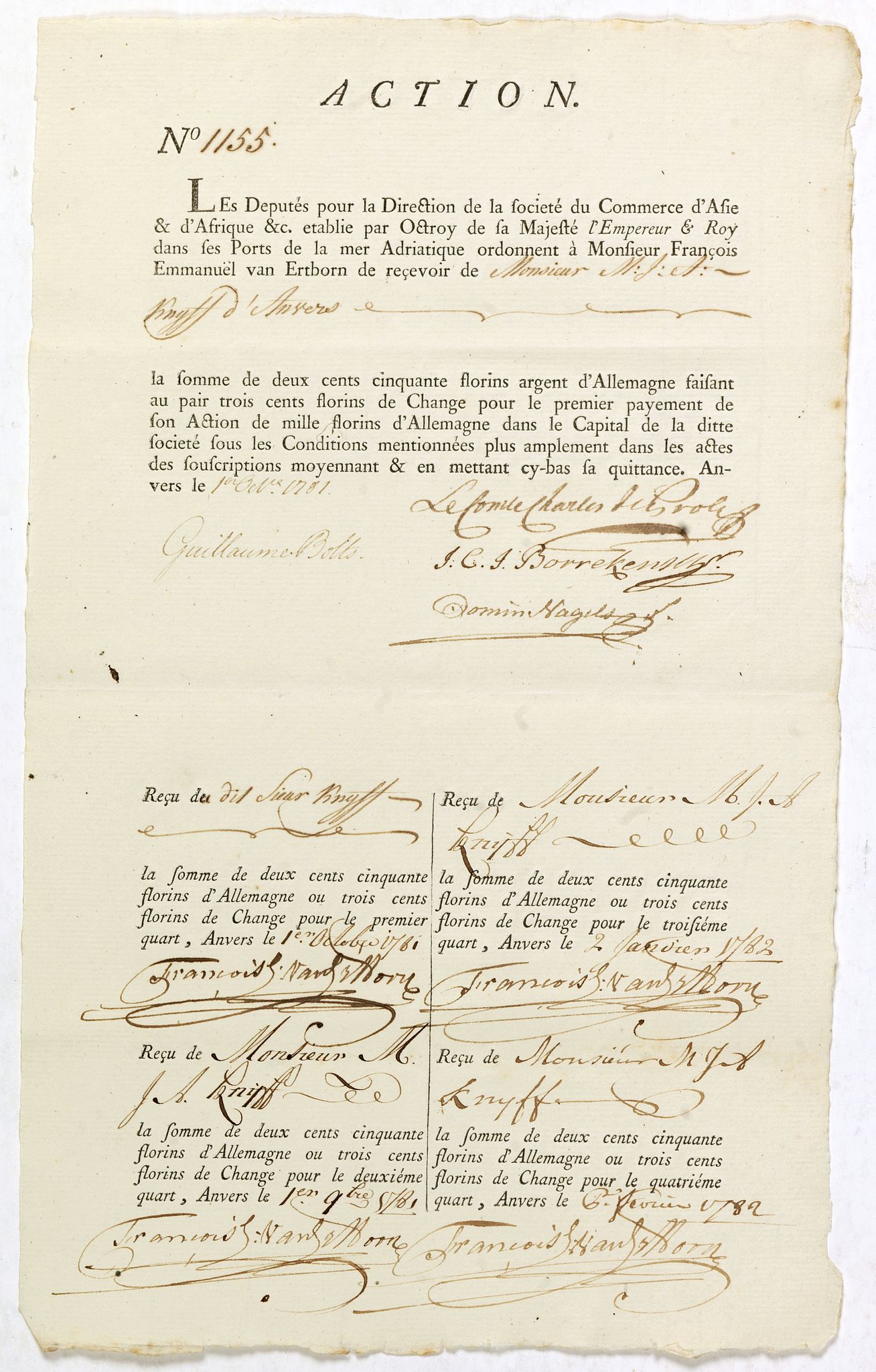 Share of 1 000 Florins d'Allemagne (1 000 Guilder) of the "Triester Handelsgesellschaft" (Société du Commerce d'Asie & d'Afrique) signed by duke Charles de Proli (General manager of the company) and Guillaume Bolts.