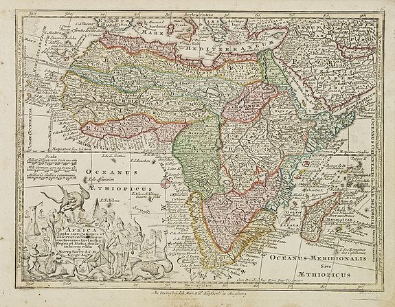 Miniature map of Africa, a reduction of the Seutter folio map based on Homann''s cartography of 1715. Very detailed - much of it fictitious. The Nile is shown not only originating in twin lakes, but also continuing further south nearly to the tip of the continent. A lake joins the Senegal and Niger rivers. The large, cartouche is beautifully engraved and surrounded by natives and exotic animals including a large winged dragon.