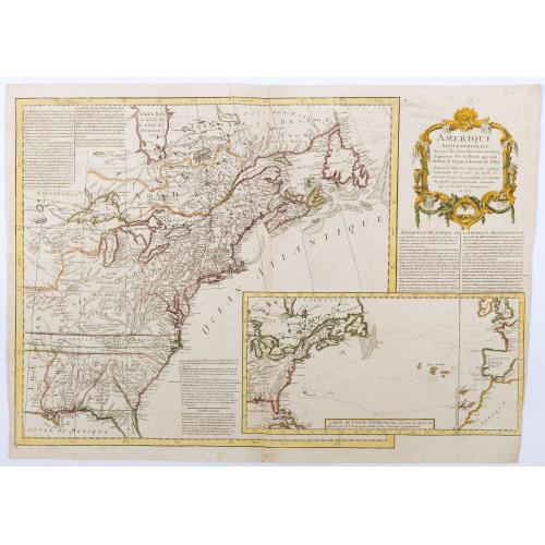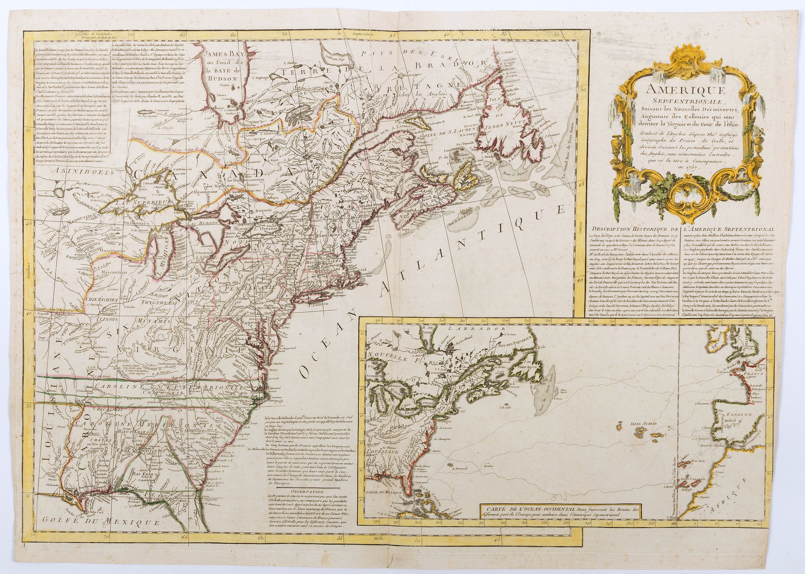 Full title: Amérique septentrionale, suivant les nouvelles découvertes, augmenté des collonies qui sont derrière la Virginie et cour de l'Ohio. Translated from the English after Thos. Gefferys géographe du Prince de Galle, et divisée suivant les pretendues pretentions des Anglois, sans néantmoins entendre, que ce la tire à concequence, en 1757. Inset map at lower right : "Carte de l'océan occidental...".