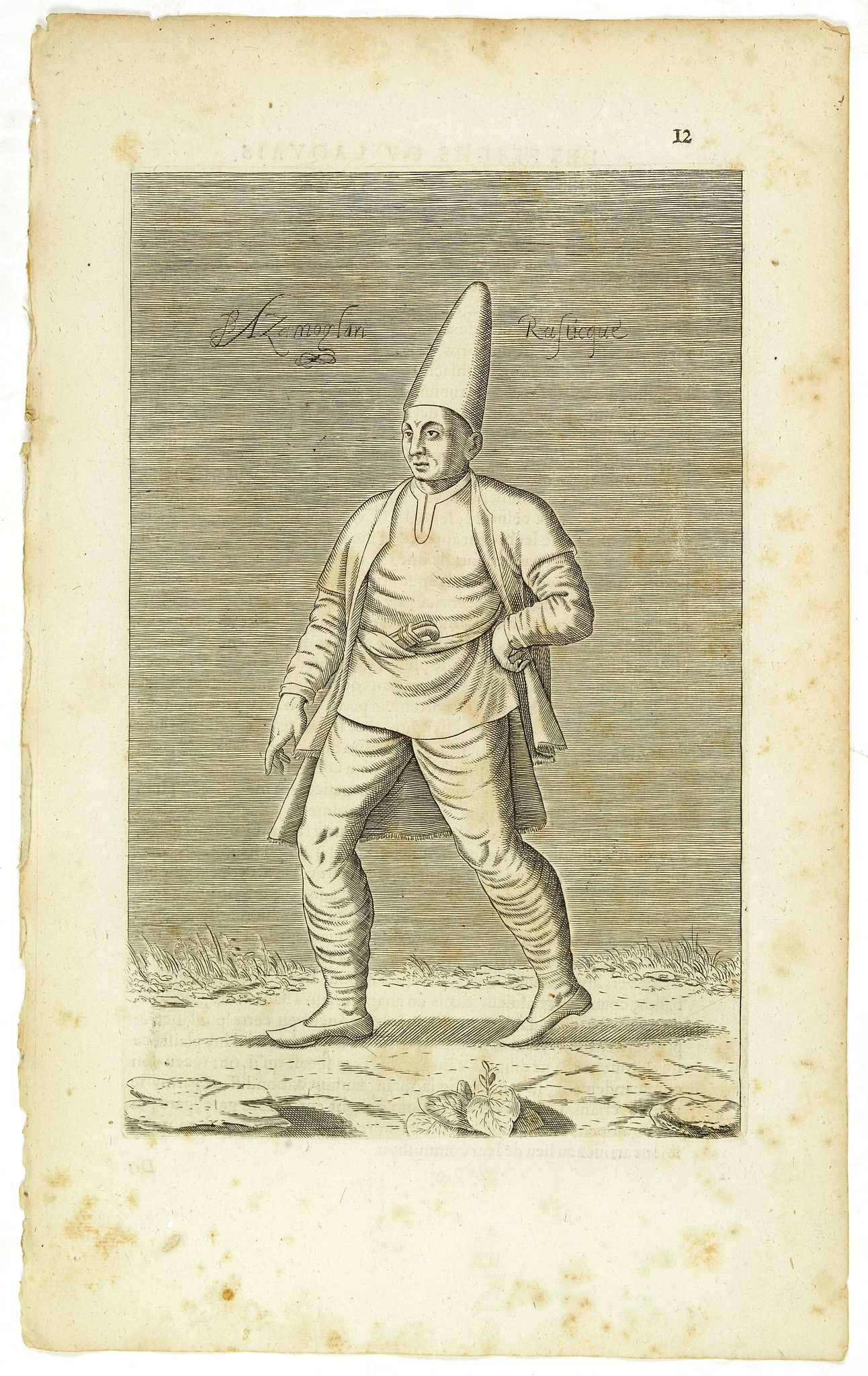 The Athenian Laonikos Chalcocondyle who flourished in the mid-fifteenth century and died in about 1464, concentrated on the later period of the Byzantine empire. His history was first published in a Latin translation in 1556. It was translated into French by the humanist Blaise de Vigenère in 1577. The 1612 edition contains a long appendix on the costumes of Turkish magistrates and officers and of the peoples subjected to them. The engravings are made after designs of the sixteenth-century French traveler Nicolas de Nicolay, seigneur d’Arfeuille.