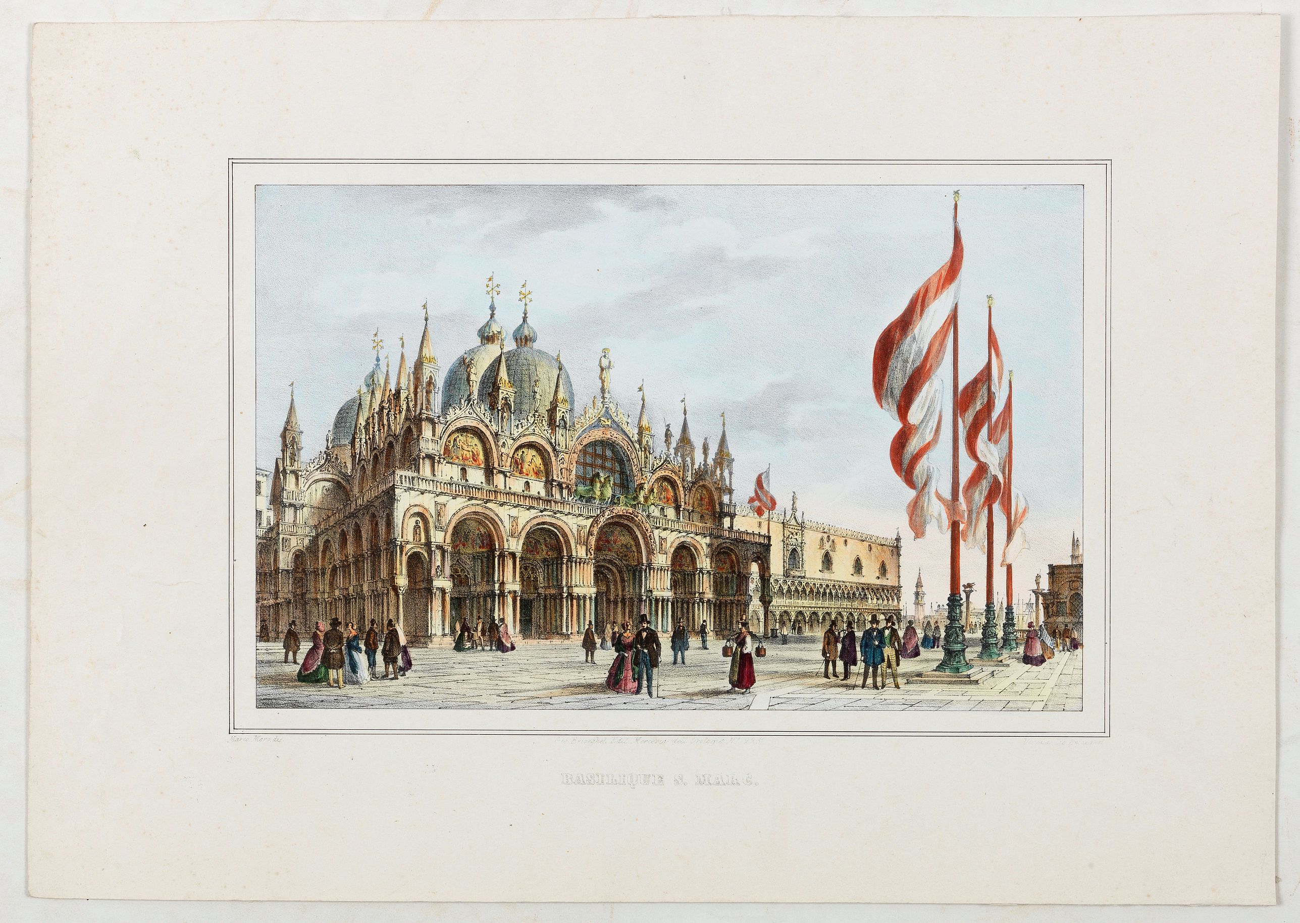 St Mark’s Basilica, lithographed in Venice by G. Brizeghel, published here with French captions in "Album delle principali vedute di Venezia". In original colours with partial albumen highlighting.