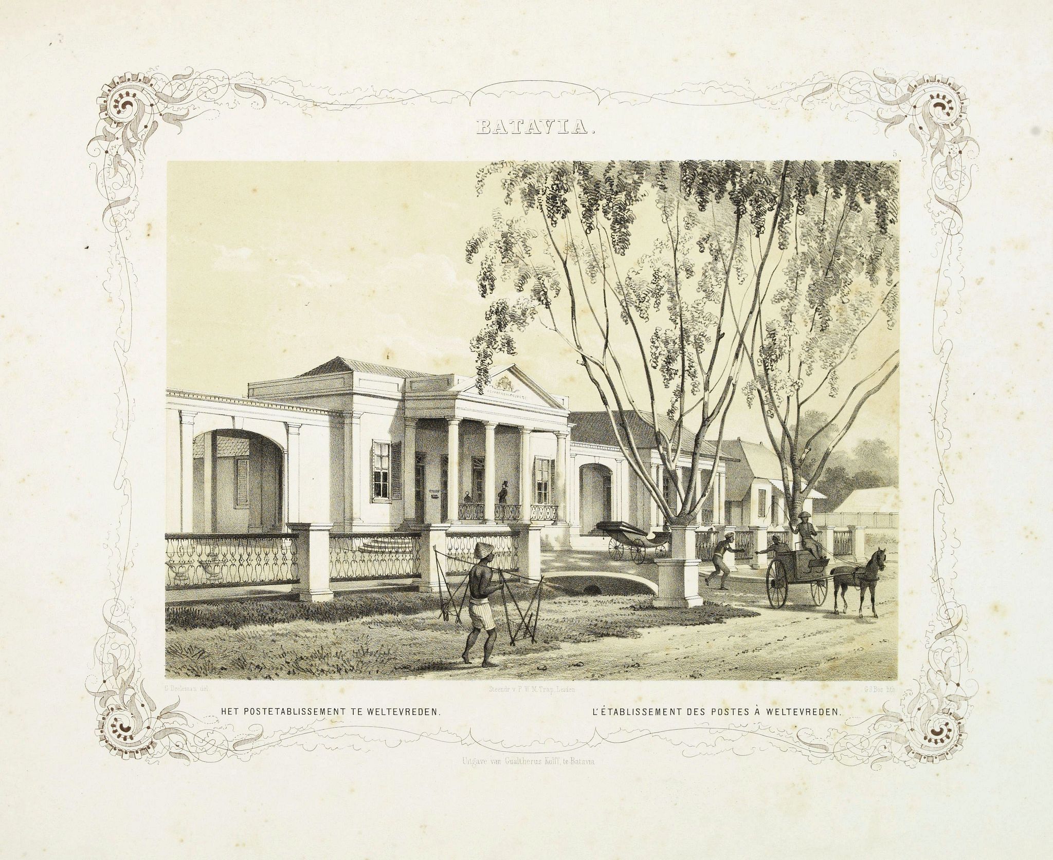 Rare lithographed view of the post office at Weltevreden (Jakarta). Beautiful lithography drawn by Charles Th. Deeleman (1823 - 1884), lithographed by G.J. Bos and printed by P.W.M. Trap at Leiden.