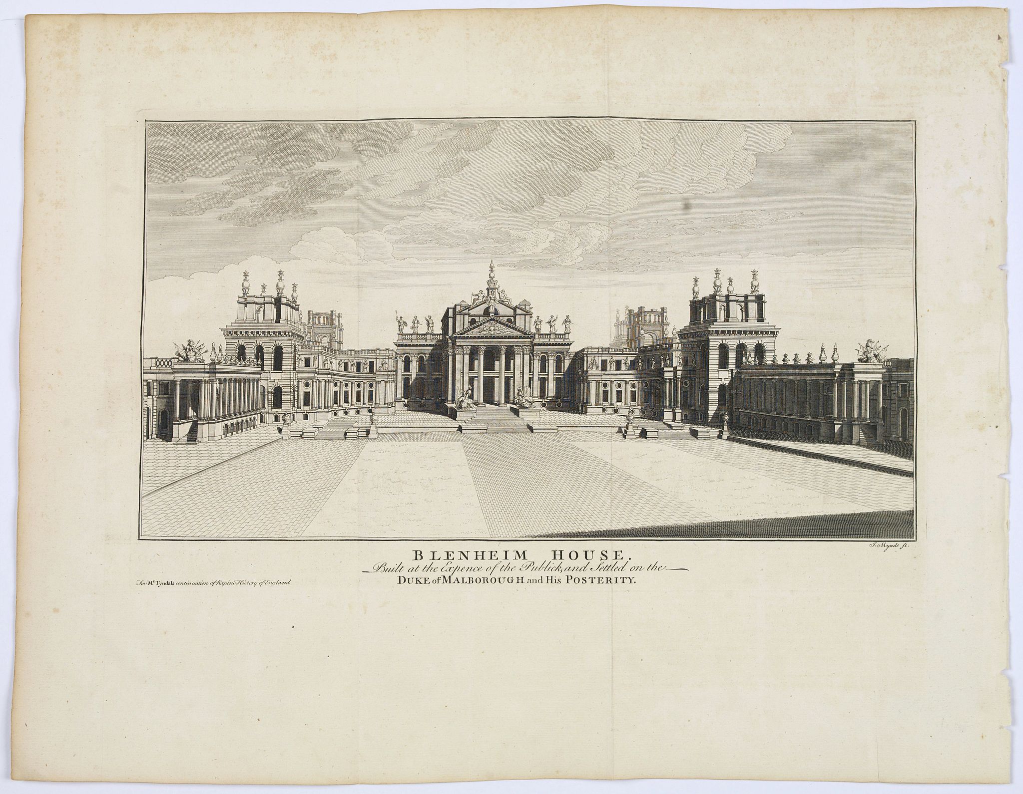 An attractive view of the front of Blenheim House (now Palace) home to the present 12th Duke and Duchess of Marlborough. The house was begun in 1705, built by Sir John Vanburgh, by order of John Churchill, the 1st Duke of Marlborough (1650-1722), near Woodstock in Oxfordshire. Churchill was a British soldier and statesman, rising to fame as the de facto leader of the allied forces during the 'War of Spanish Succession' with victories on the field at Blenheim (1704), Ramillies (1706), Oudenarde (1708) and Malplaquet (1709).