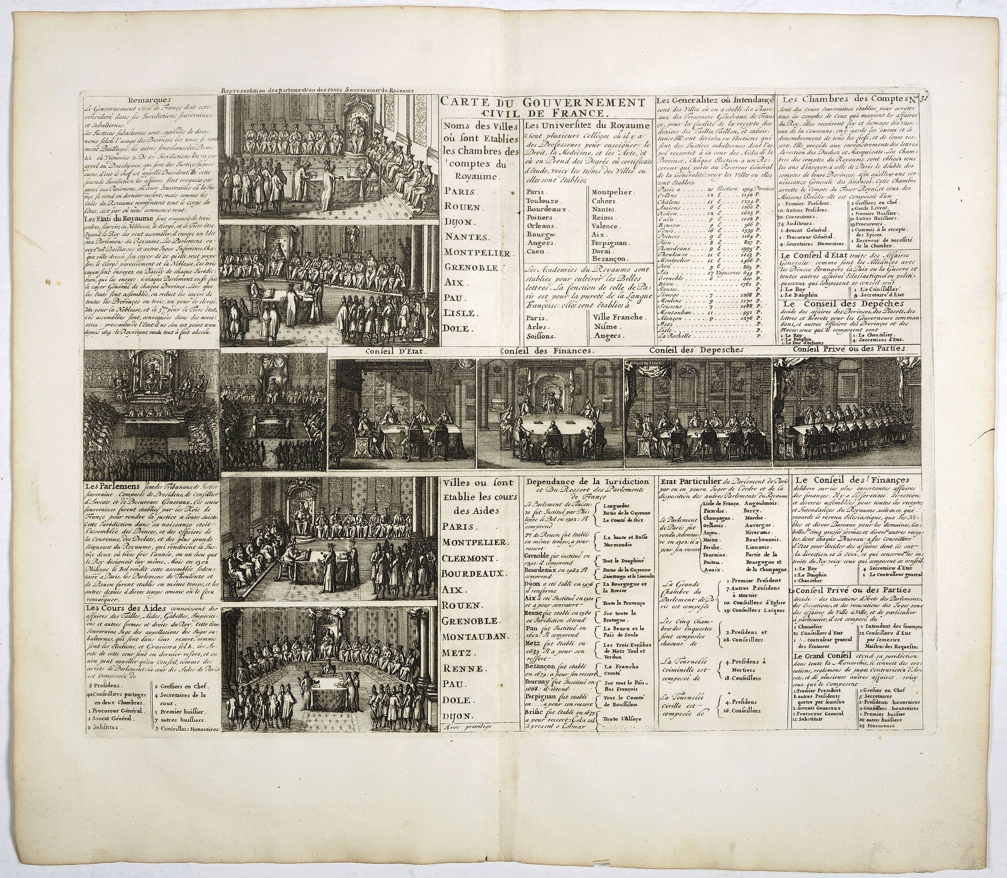 This impressive engraving is a wonderful example of Chatelain’s elegant plates. It provides a detailed description of the infrastructure of the French government.