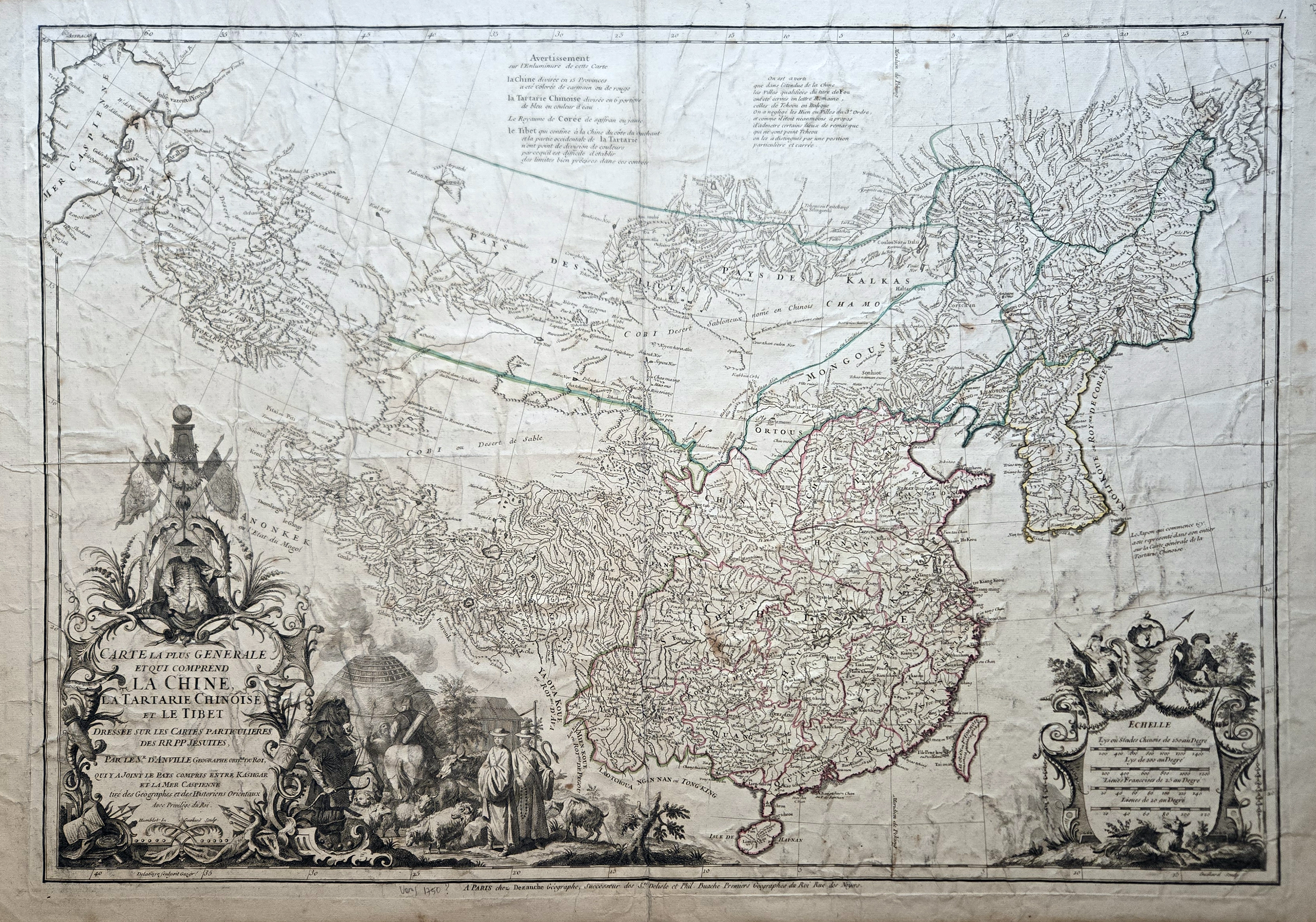 The ornate cartouche shows emperor Kang Hsi presiding over the survey he had ordered the Jesuits to execute in his name between 1708 and 1716. Two fathers, with an armed mounted escort, are investigating a farmer settlement, his lodging and cattle. The scale cartouche is adorned by two wolf hunters.