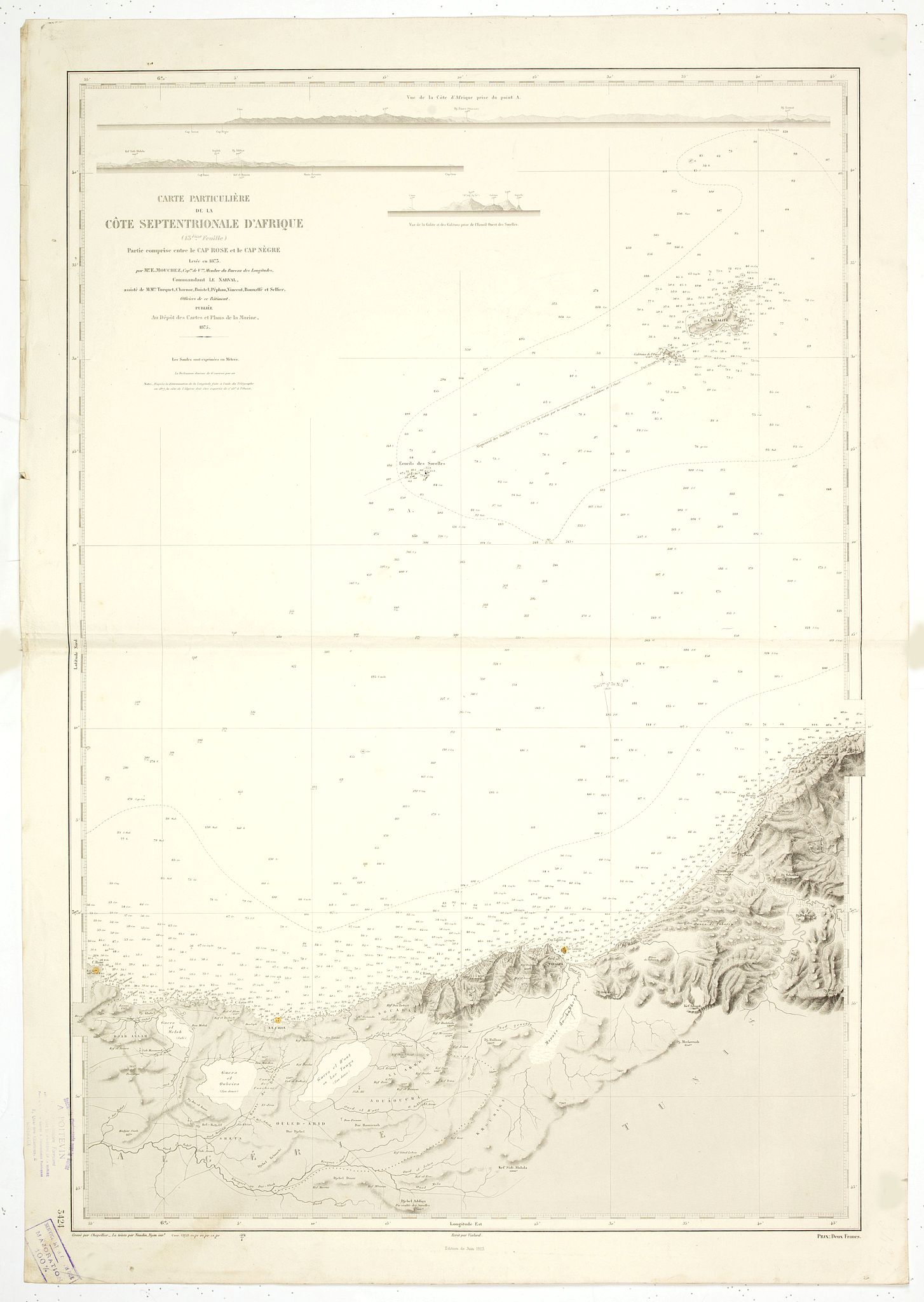 A fine French Service Hydrograhique de la Marine chart no. 3424, showing Cape Rose and Cap Nègre, in Algeria, drawn in 1873 by E. Mouchez, updated to 1913. Chart engraved by Chapellier.