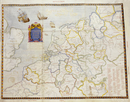 Numerous towns indicated by settlement symbols, regions delineated by wash outlines, rivers in blue, place-names in sepia, regional names in red, countries and seas in gold. The waters are decorated with wavy blue lines, three ships (flying the French flag) and a sea monster. The title is set in the North Sea as a tableau cartouche with scale bars below, surrounded by ruled sepia borders with multi-colored infills, and inset tables of the principal towns at the lower right corner.