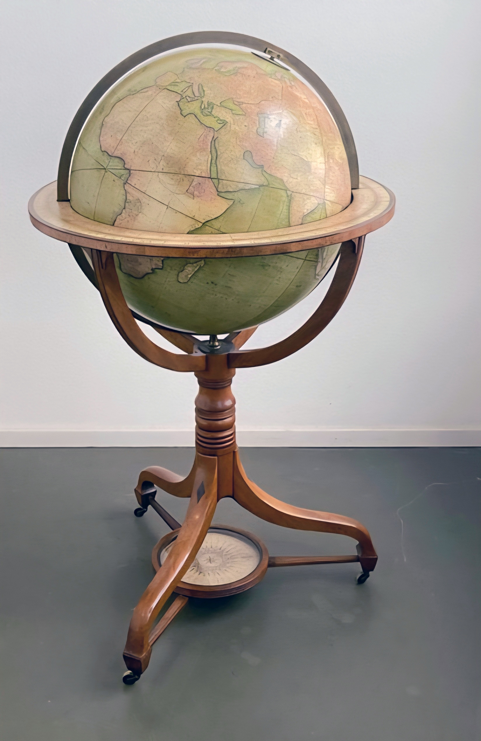 The globe exhibits some typical discoloration or fading, consistent with its 200-year-old age. The globe has recently undergone professional restoration; small missing areas have been filled in, and it now features a new layer of varnish.