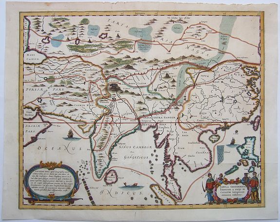 This fascinating map covers an immense area and depicts at least four routes available to Europeans for eastern travel during the 17th century. The northernmost originates north of an irregularly shaped Caspian Sea and meanders through the region historically known as Tartary before ending at the Great Wall. The southernmost route starts in the Persian Gulf and makes land near Mumbai, before proceeding overland into the mountains of Nepal. A sea route through the Strait of Malacca, and other overland routes through India, China, and Myanmar are also shown.