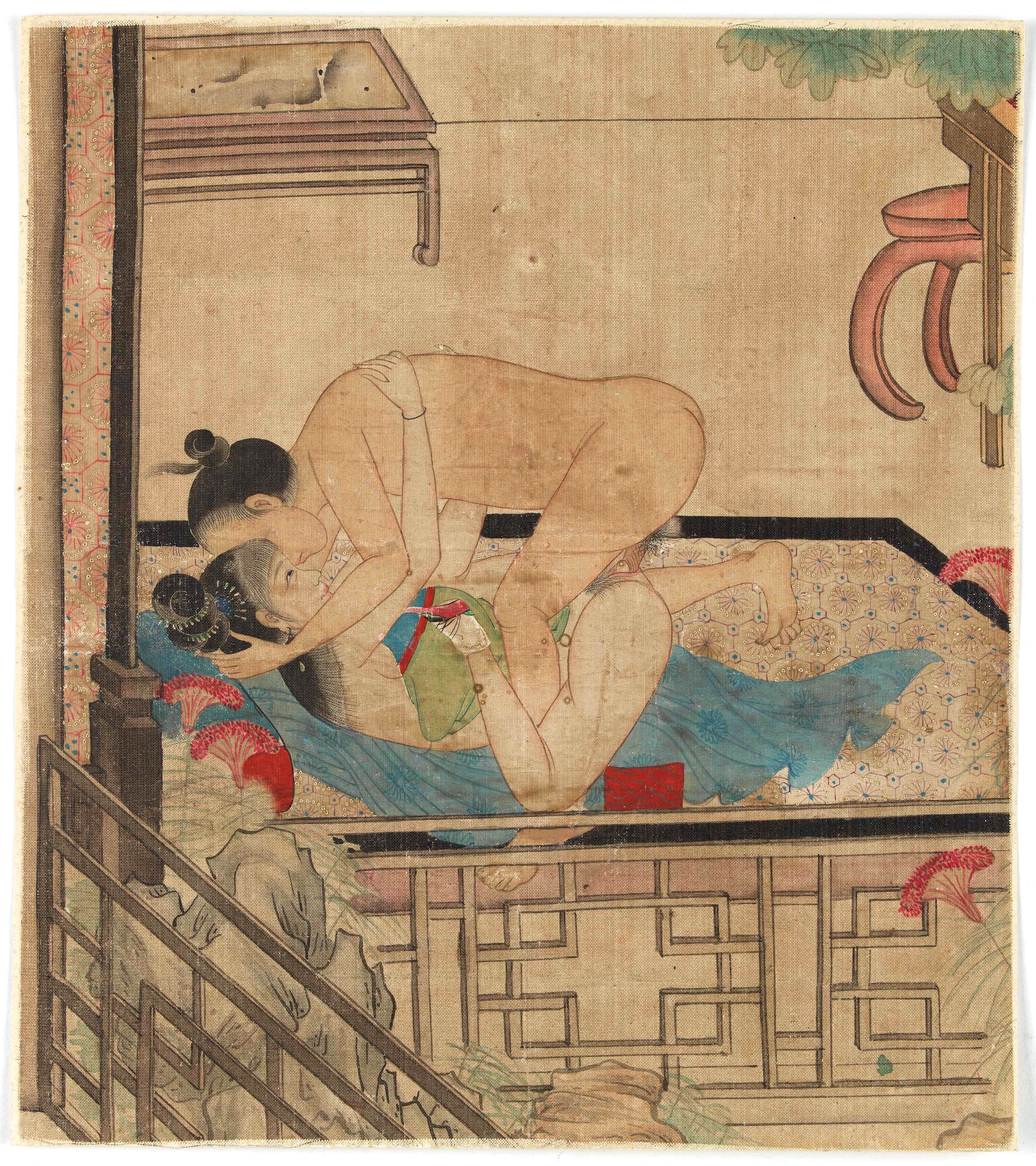 Chinese painting on silk of a couple in a love-making position.