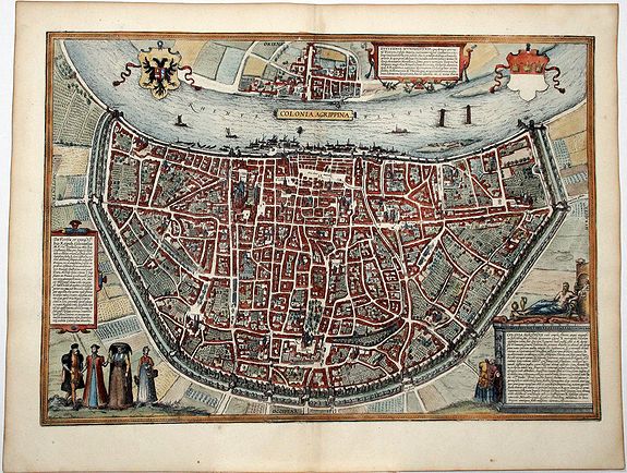 Prominent in the lower half of the map is the Romanesque basilica of the Holy Apostles. A major city since Roman times, in 1288 Cologne became an imperial city. Close trading links with England encouraged its rapid economic growth and the Cologne exchange was founded in 1553. The crowded clocks illustrate the city's lively commercial traffic.