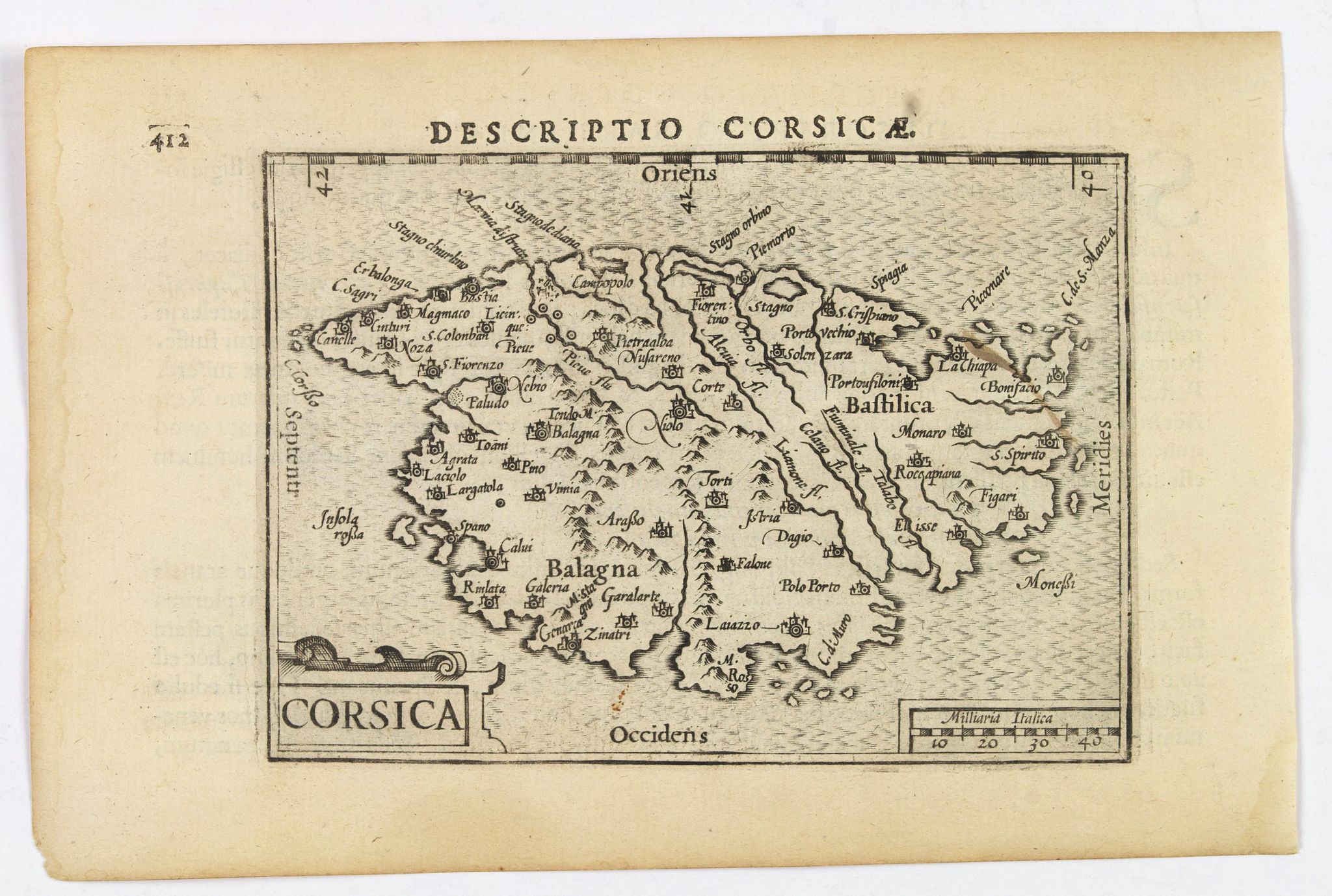 A fine miniature map of the French island of Corsica, published by Petrus Bertius in Amsterdam early in the seventeenth century. The map features a strap-work title cartouche, and a rectangular mileage scale in each of the lower corners.