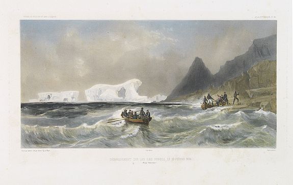 Exquisite contemporary colored lithograph of the Powell islands, situated near the South Orkney Islands, with Dumont D'Urville's officers leaving the island. Drawn by Louis Le Breton, lithographed by Sabatier and Mayer.