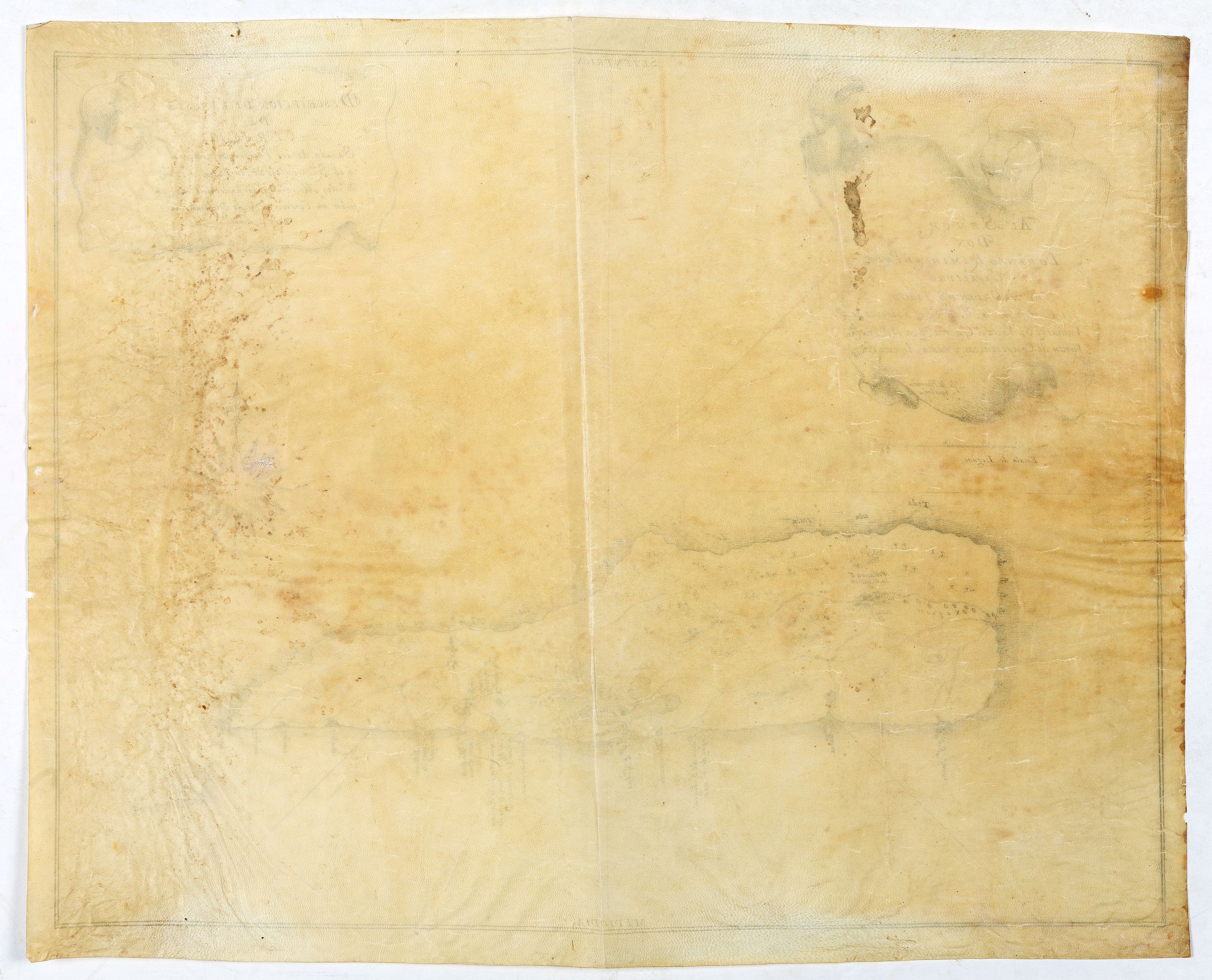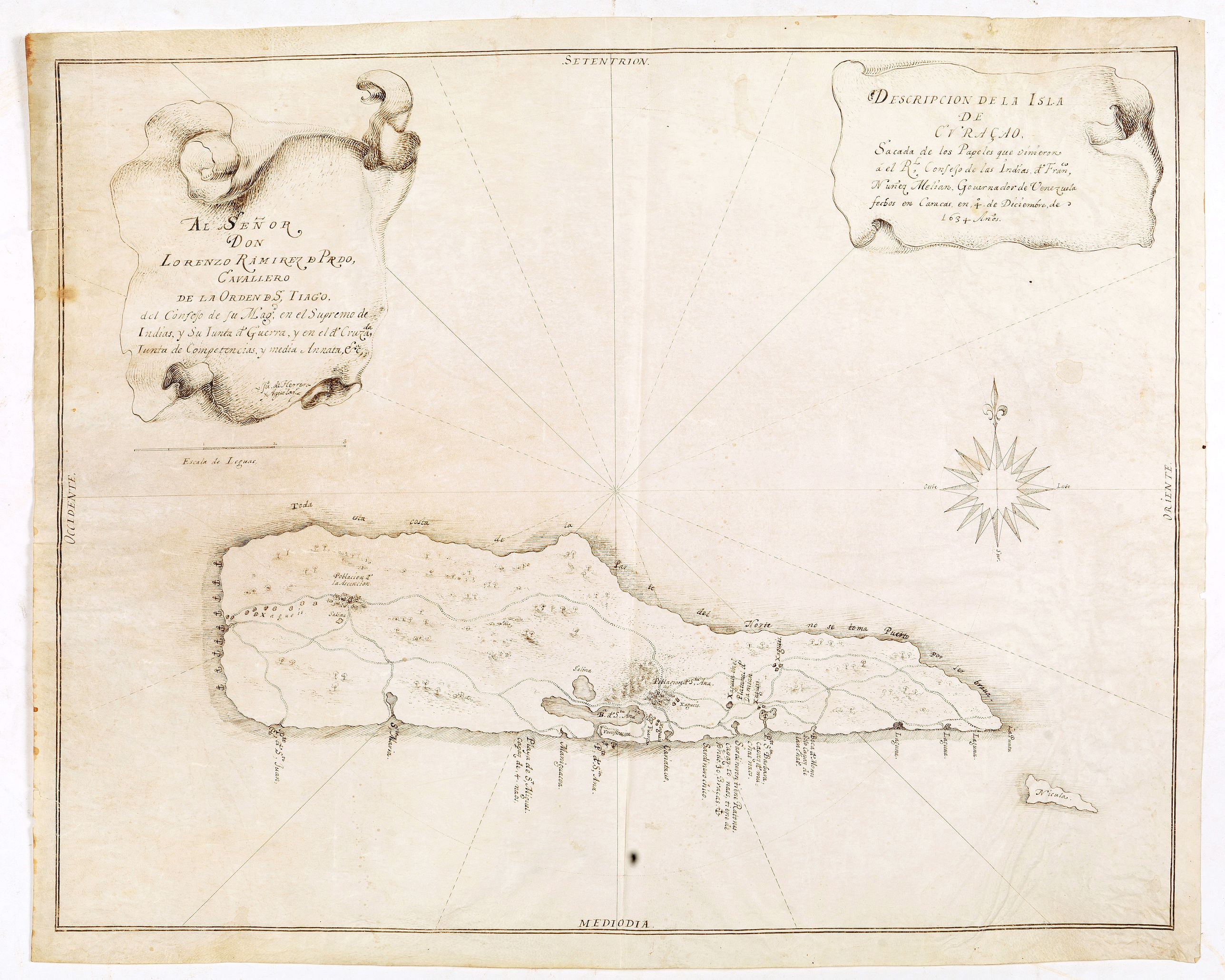(Sevillia, c.1635-1652) 415x528mm. A very important manuscript chart (Padron) in brown ink on vellum of Curaçao. Very good condition. The chart is very detailed, has many anchor places and names. We see east of Willemstad: “Puerto de Santa Barbara capaz muchos naos”, i.e. the Spanish were aware that this natural harbor could accommodate many ships. Initially, this natural harbor had two inlets; one of them was blocked by a sunken ship in 1639. Afterwards, the harbor could only be entered by passing Caracas Bay. The map has a dedication to Lorenzo Ramírez de Prado (1583-1658) : "Al Senor Don Lorenzo Ramirez de Pardo, cavallero de la orden D S, Tiago del consejo de su Mag, en el Supremo de Indias, y en d. Cruzada, Iunta de Competencias, y media Annata, Eca."