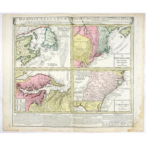 Four maps on one sheet (New Found land/ New England/ Virginia and Carolina/Florida) based on J.B.Homann's map, showing British possessions in North America.