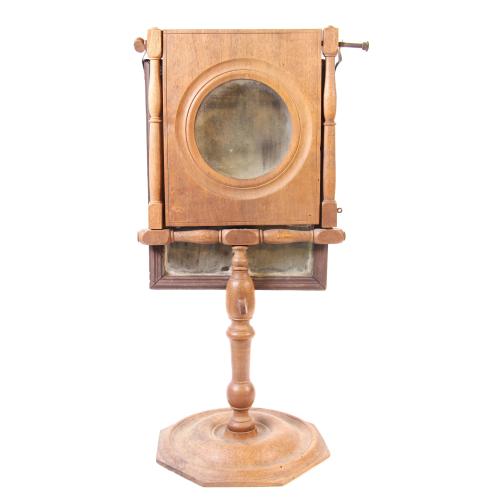 Rare so-called zograscope or optical mirror. A zograscope is an optical device for enhancing the sense of depth perception from a flat picture. It consists of a large magnifying lens through which the picture is viewed. This model has the lens mounted on a stand in front of an angled mirror. This allows someone to sit at a table and to look through the lens at the picture flat on the table.