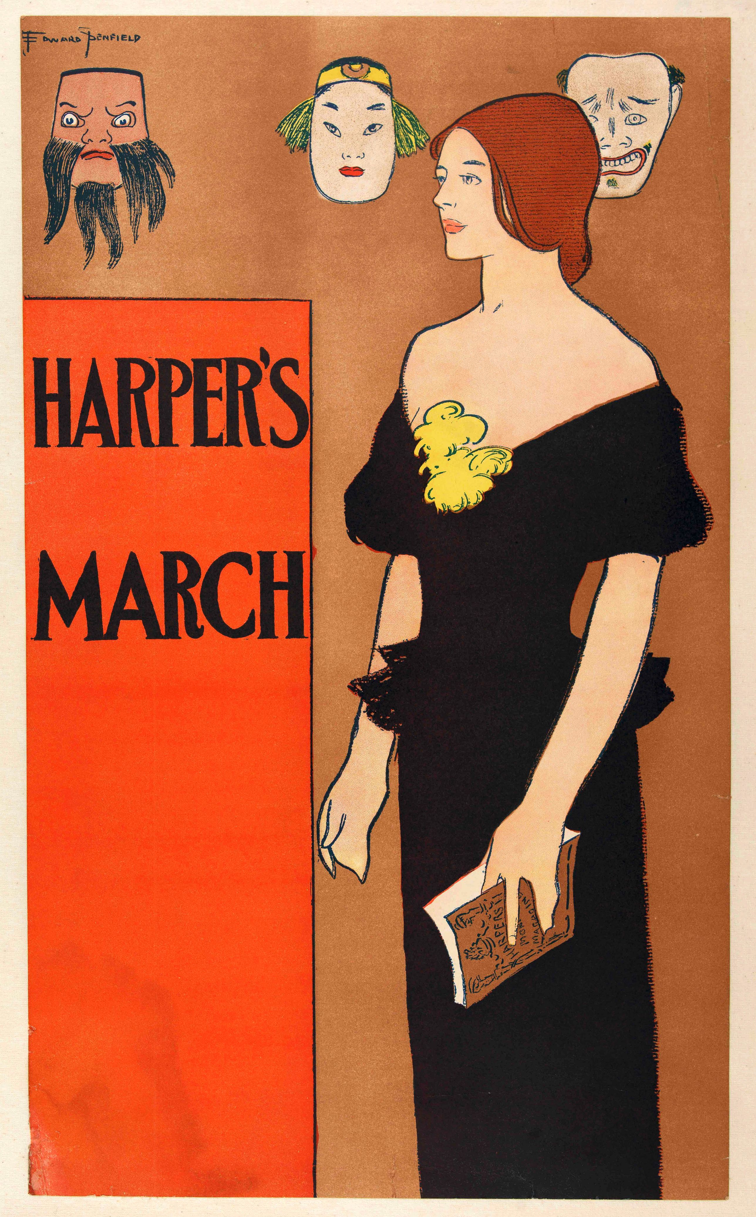 Decorative advertising poster for Harper's Magazine. The poster shows a woman holding a Harper’s magazine in her left hand, though she does not read it. Dressed as if for the theater or a museum opening, she merely stares blankly out of the frame and does not engage with the three caricature masks that hang on the wall above the orange plinth.
