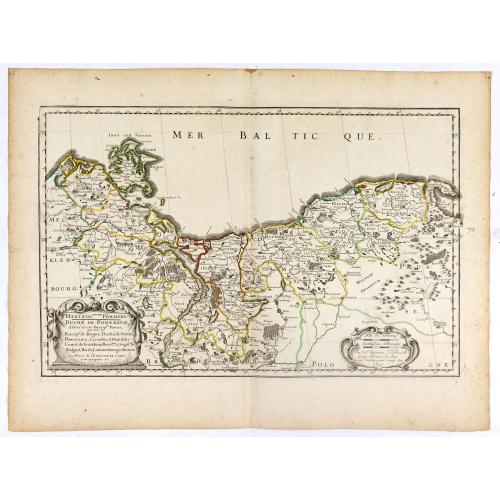 Rare, antique map of  HERTZOGTHUMB POMMERN DUCHE DE POMERANIE divise en ses Princip les Parties qui sont les Princip te de Rugue, Duche de Stettin, Pomeranie, Cassubie, et Wandalie . . .