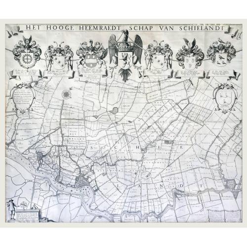This beautiful wall map of "Het Hooge Heemraedtschap van Schielandt" is on nine attached leaves (each leaf 49x58,5 cm. ) engraved by J. VINGBOOMS after J.J. STA...