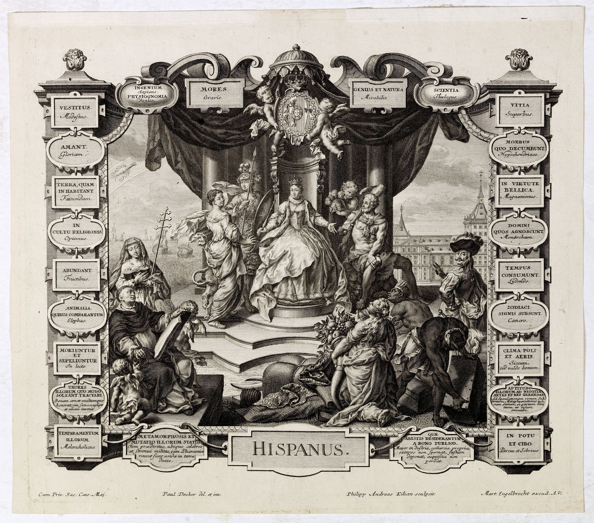 Allegorical print of Spain (Hispanus), copper engraving after P. Decker by M. Engelbrecht. Taken from "Laconicum Europae Speculum". Philippe Andrea Kilian (1714-1759).
