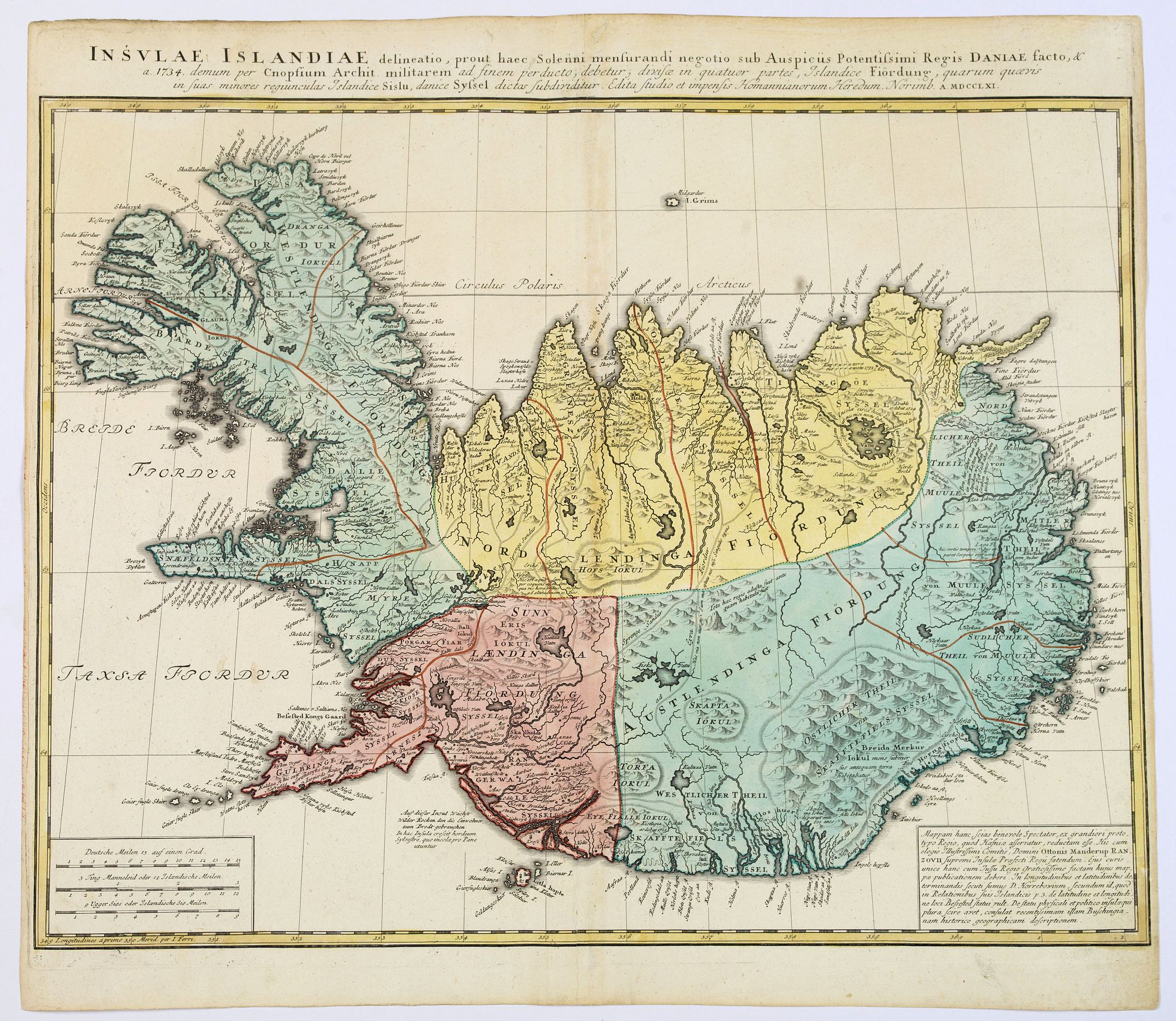 A nice large map of Iceland published by Homann Heirs. The country is divided up into four differently colored regions, lettered title to top of map, boxed mileage scales and explanation box in each bottom corner.