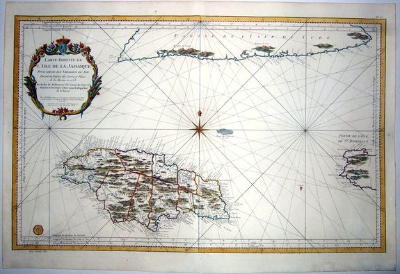 Superb, large-scale sea chart of Jamaica that is politically divided into parishes and centered on an eight-point compass rose. The map includes remarkable detail with scores of place names and safe anchorages along the coast, in addition to mountains, roads, personal estates, watershed and other details in the interior. Part of the southern coast of Cuba and the western tip of Hispaniola (Haiti) are also shown. A large decorative rococo-style cartouche further enhances the chart.