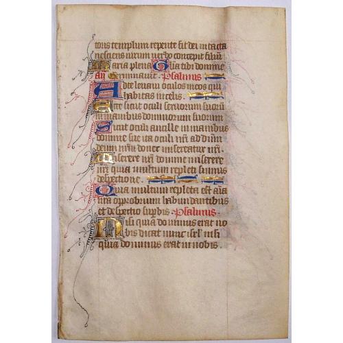 A beautifully decorated vellum leaf from a Book of Hours, written in France around 1450. The decoration : penwork with all 17 initials in red, blue and black: gold leaf on many initials and line fillers!