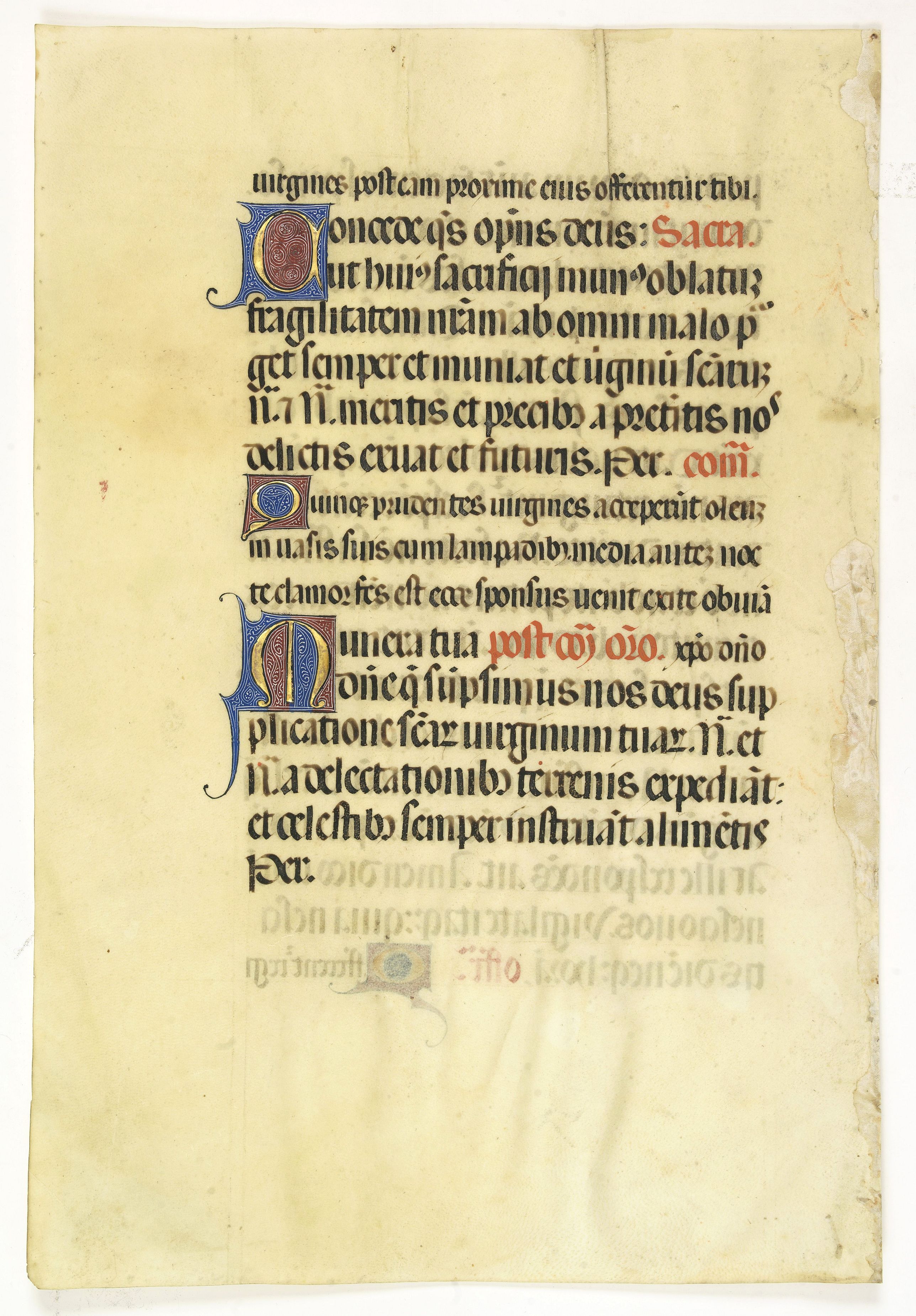 A very fine large size Missal leaf, written in Latin. VERSO: Two wonderful 2-lines initials and in liquid gold decorated with pen work in purple and blue. One 1-line init...