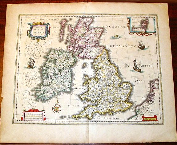 An elegant map of the British Isles by Dutch cartographer Willem Blaeu (1571-1638), the progenitor of the famous Blaeu cartographic firm of Amsterdam. This is a good example of the quality of the firm's work, with topographical information carefully engraved and incorporating the most up-to-date information. An inset map of the Orkney Islands in the upper right corner is nicely balanced by cartouches in the other corners, each a decorative gem.
