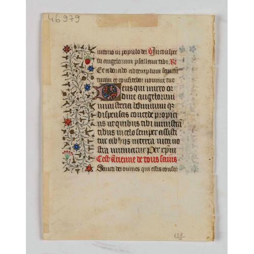 This vellum leaf has on each side a large 2-line initial illuminated in blue and red with white heightening, on a very heavily burnished gold ground. Illuminated borders...