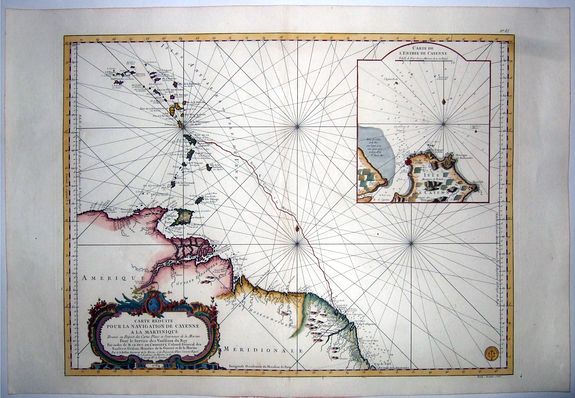 In short, this map provides the most up-to-date information relevant to sailing the Atlantic Ocean between these two French colonies. -North is up.