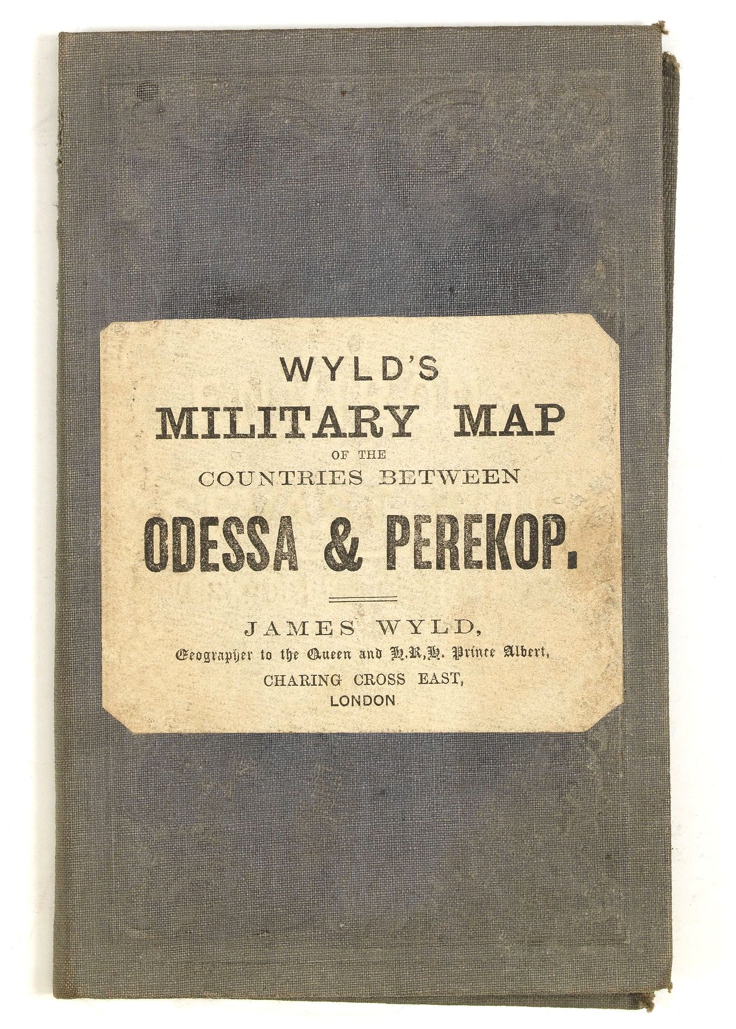 Rare colored linen-backed map showing Russian troop positions and Odessa Batteries. On the inside of the cover a list of "Wyld's list of recent publications : seat of war, Turkey, the Baltic, Russia, Austria and Prussia".