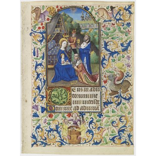 Miniature of three kings offer gifts to the Christ Child, who is held by Mary. |
