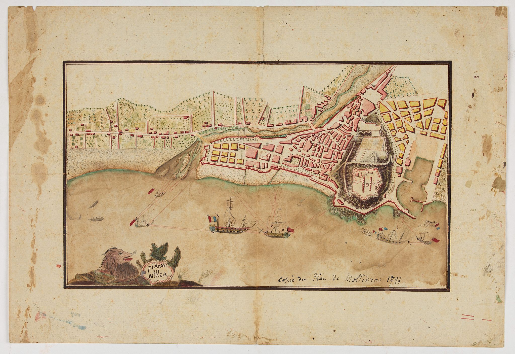 Rare 1797 manuscript map of Nice, with the French navy attacking from the sea. Unknown author, Italian, but map attributed to an original, probably broadsheet map by Mollieras (?). Good plan of the layout of Nice and the port and coast as was in 1797. Ships are perhaps a trifle naive. This attack is not covered by any other antique maps or prints.