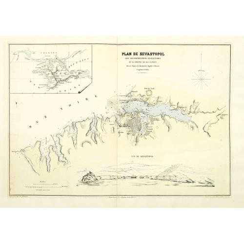 Plan de Sevastopol avec ses fortifications ses batteries et la portée de ses canons. |