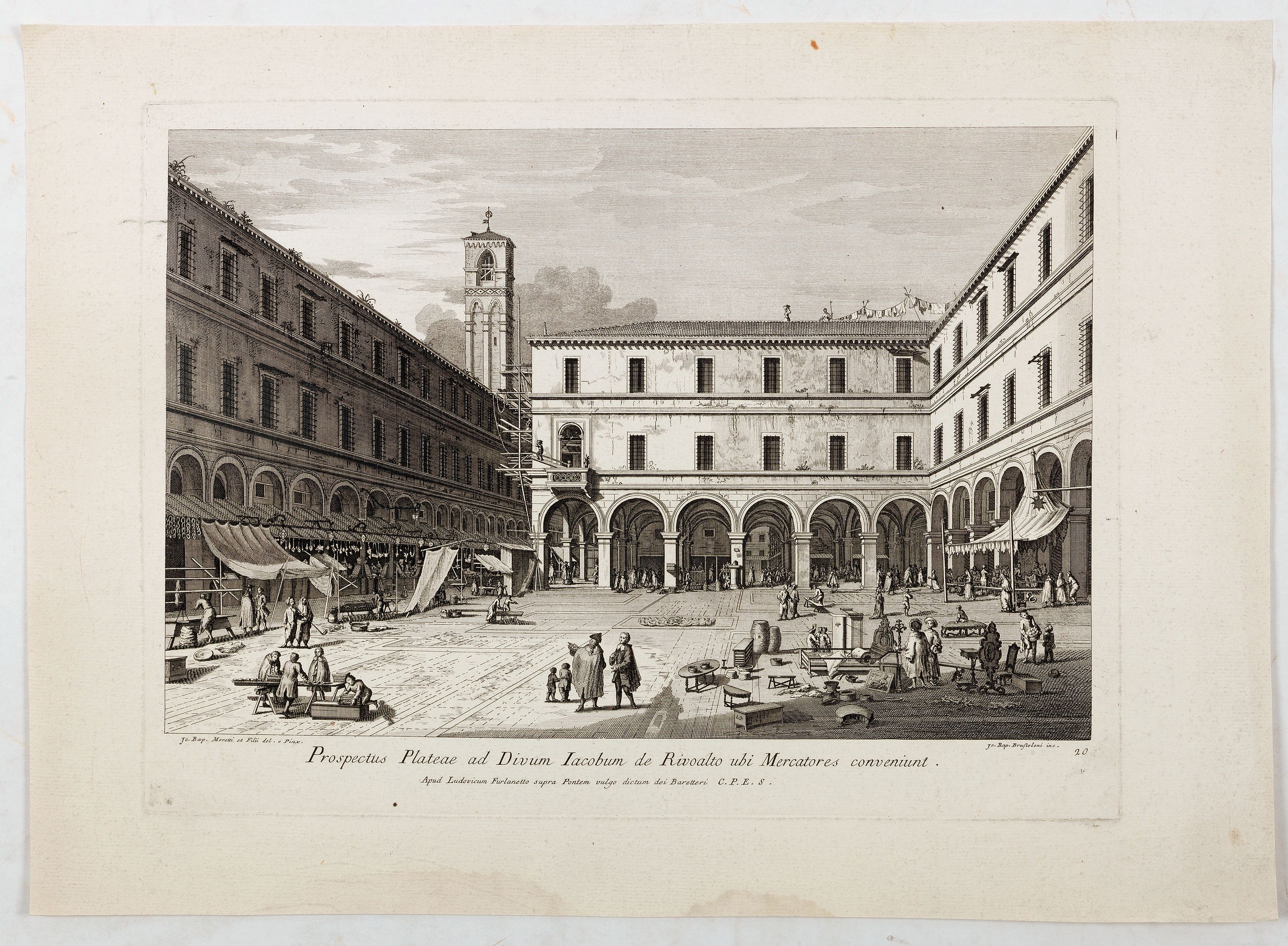 Prospectus Plateae ad Divum Iacobum de Rivoalto ubi Mercatores conveniunt. From the series "Prospectum Urbis Venetiarum" (Views of Venice). Published by Lodovico Furlanetto. Jo. Bap. Moretti et Filii del. e pinx., Joan. Bapta Brustoloni sculpsit. Numbered 20.