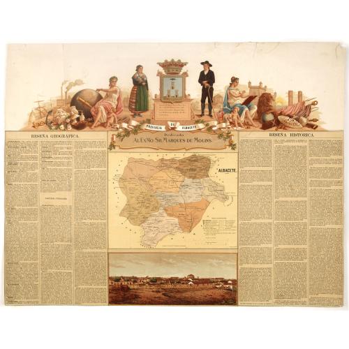 Chromolithography published in "Atlas geográfico histórico de las Provincias de España". Map made by M. Vierge, Dedicated to Ilmo. Sr. Dn. Vicente Barrantes. Depicts a map of the province of Albacete in the center with a view of the town underneath, ornated in the upper part with allegorical representations and traditional costumes framing the coat of arms of the city. Two side panels with geographical and historical description of the area.