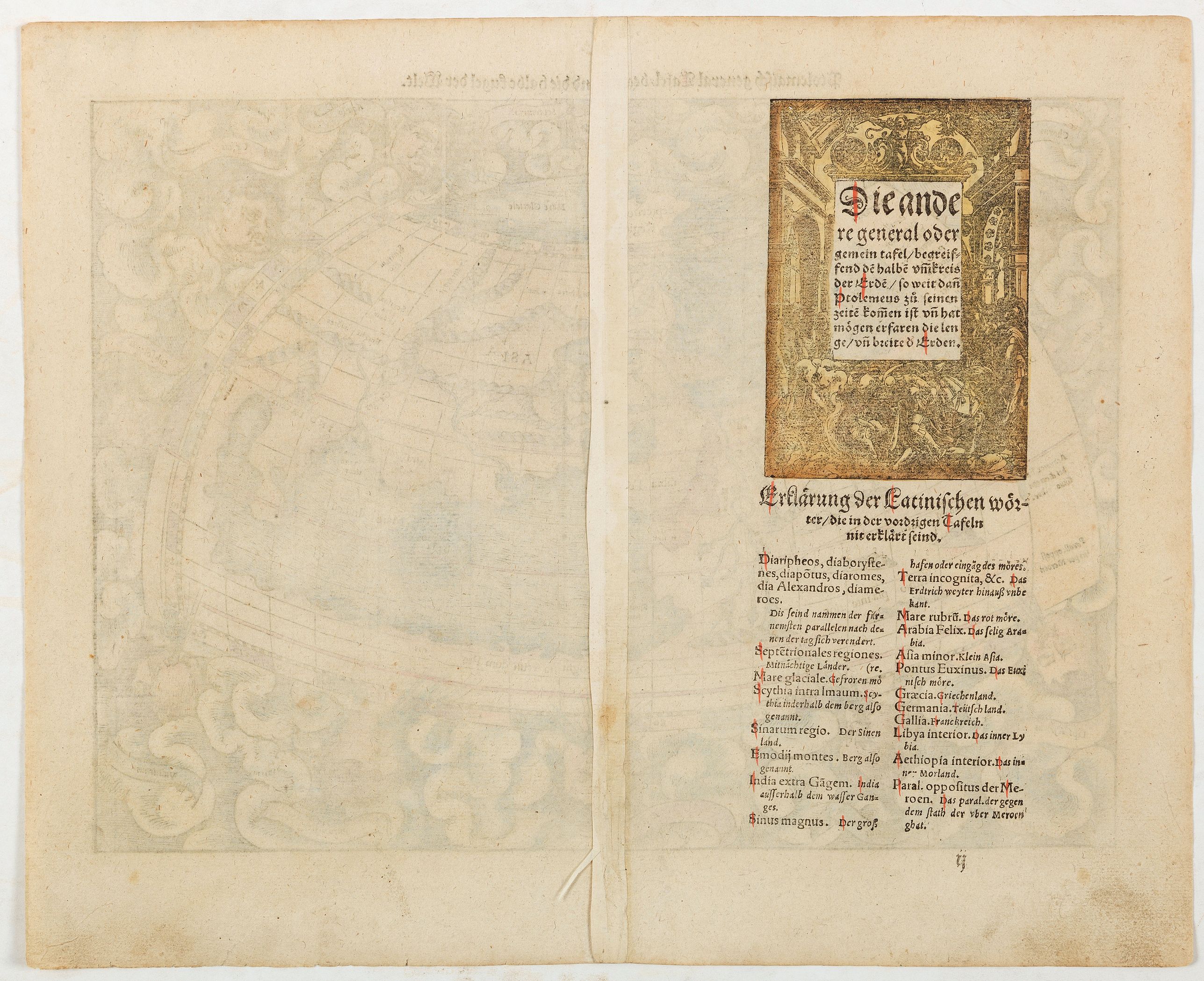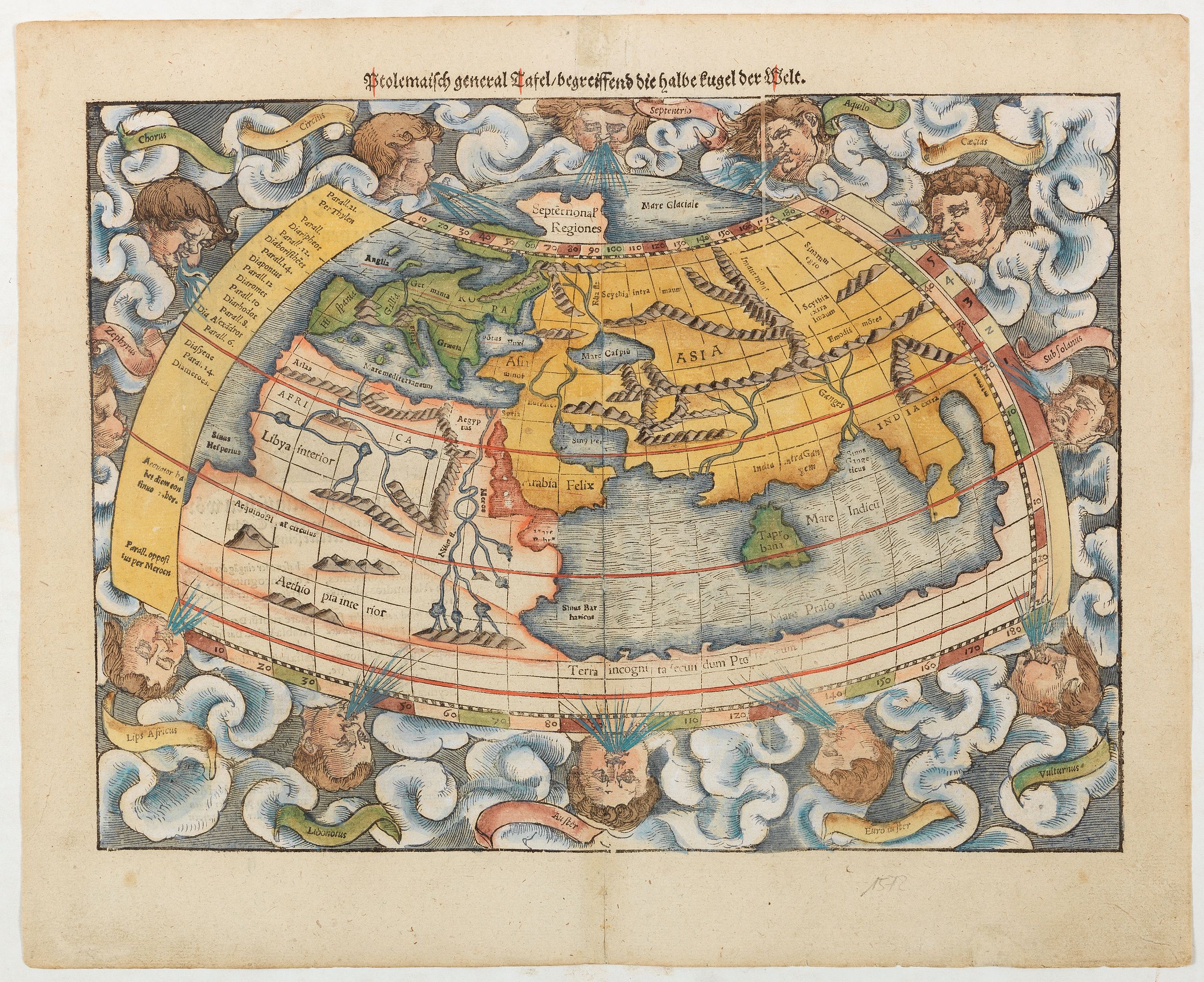 A famous wood block map of the Polemic world. There are 12 wind heads surrounding the then known world, with such romantic names, in banners, as Zephyrus, Corus and Subso...