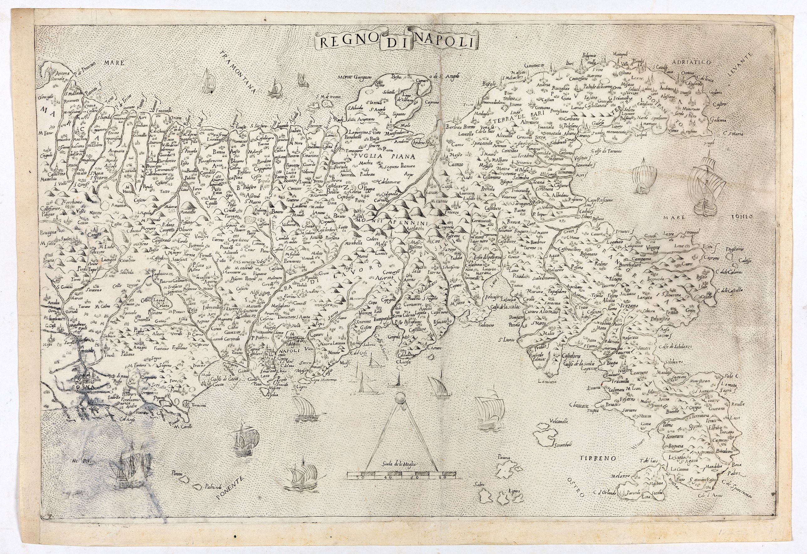 At the bottom, in the center, a compass highlights the Miles scale. Anonymous map, without date or editorial indications. This is a replica of the Kingdom of Naples by Ziletti of 1557 and its derivations. From a cartographic point of view, it appears to be a true copy of the Lafreri map, with very small differences in the toponyms, such as the omission of the thalassonym in the Ionian Sea, which on the Lafreri map is indicated as TEMPLE OF JUPITER.