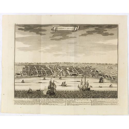 Decorative panoramic view of the town of Samboupo on the island of Celebes (Sulawesi) in today's Indonesia. Dutch (V.O.C.) sailing ships and various local craft fill the foreground. The city with great detail including the fort and hundreds of individual houses and buildings.