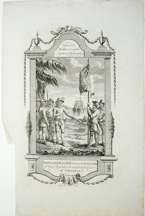 Sir Walter Raleigh ordering the standard of Queen Elizabeth to be erected on the coast of Virginia, 1584. |