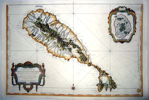 At the upper right is a large inset map of Nevis in a rococo frame. It shows soundings, anchorage's, channels, shoals, navigational sightings. Engraved by Petit, engraver for the Depot Générale de la marine is noted as such on the map. With the seal and the Prix. Trente Sols. A beautiful chart in fine condition.