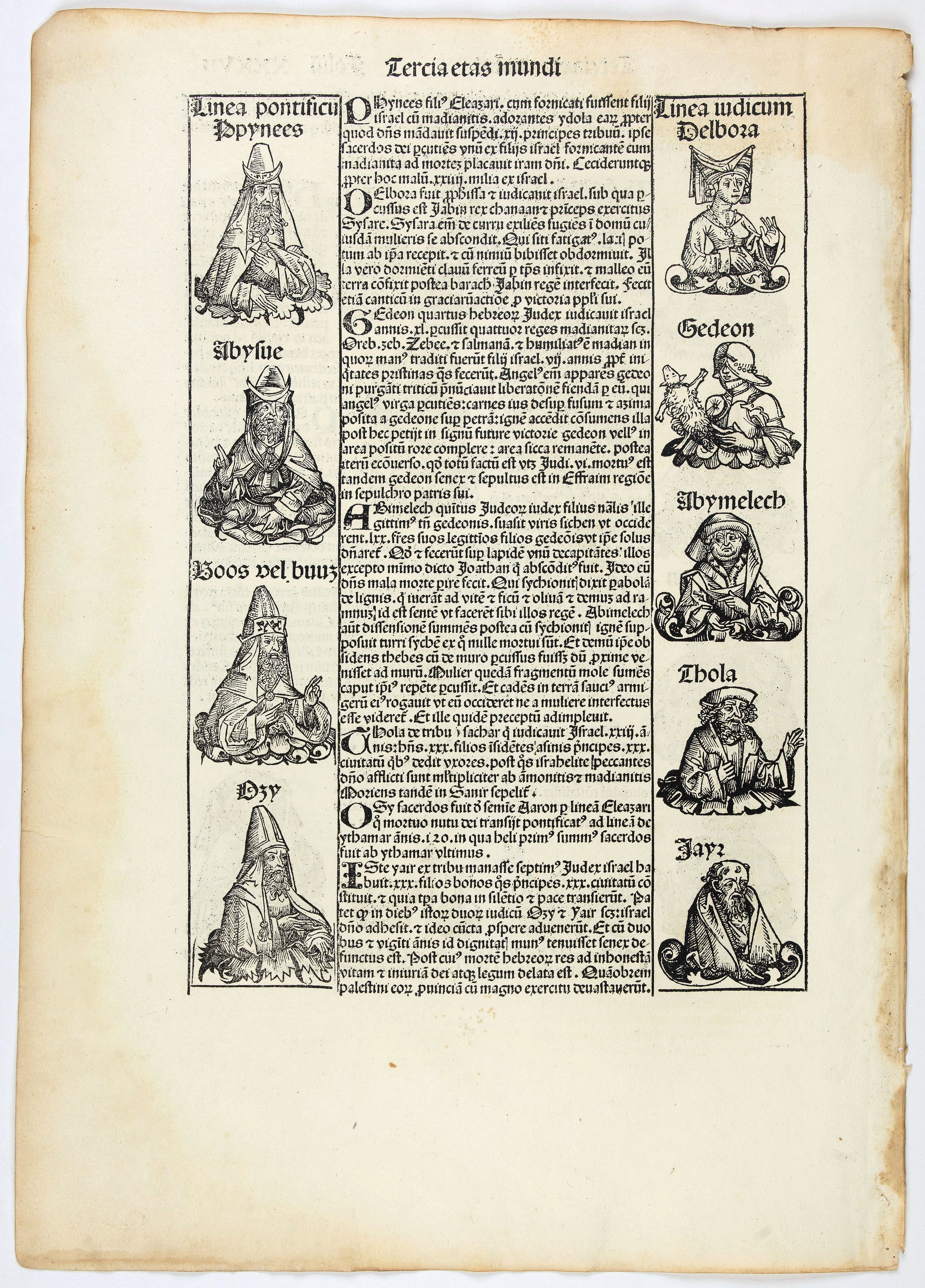 Page from the richest illustrated Incunable, the famous: Nuremberg Chronicle, published the year that Columbus returned to Europe after discovering America. In May of 1493 appeared in the Latin language one of the earliest voluminous books, fully illustrated with 1809 woodcuts printed from 645 woodblocks.