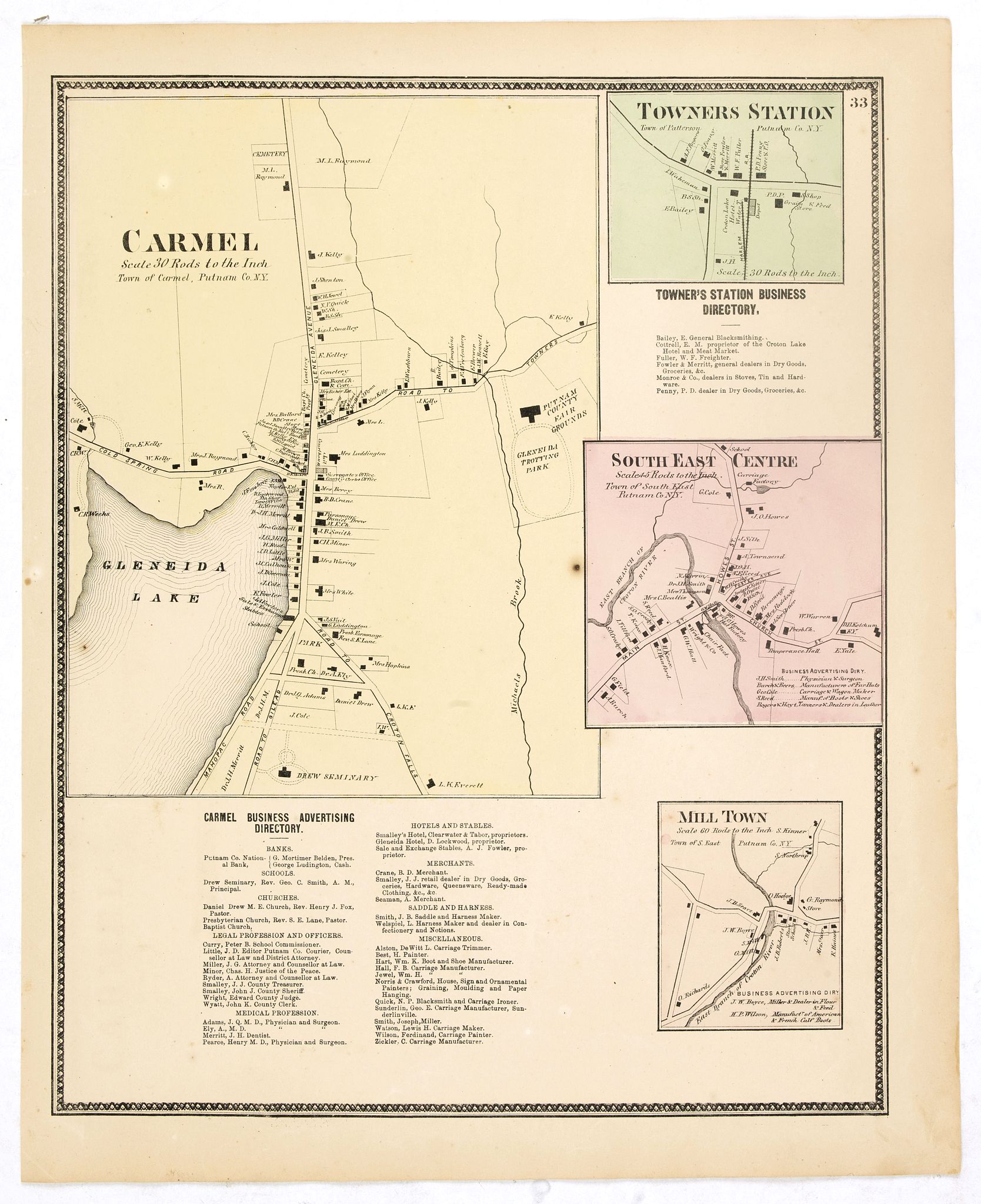 Rare, antique map of  Town of Carmel / Towners Station / South East Centre / Mill Town.