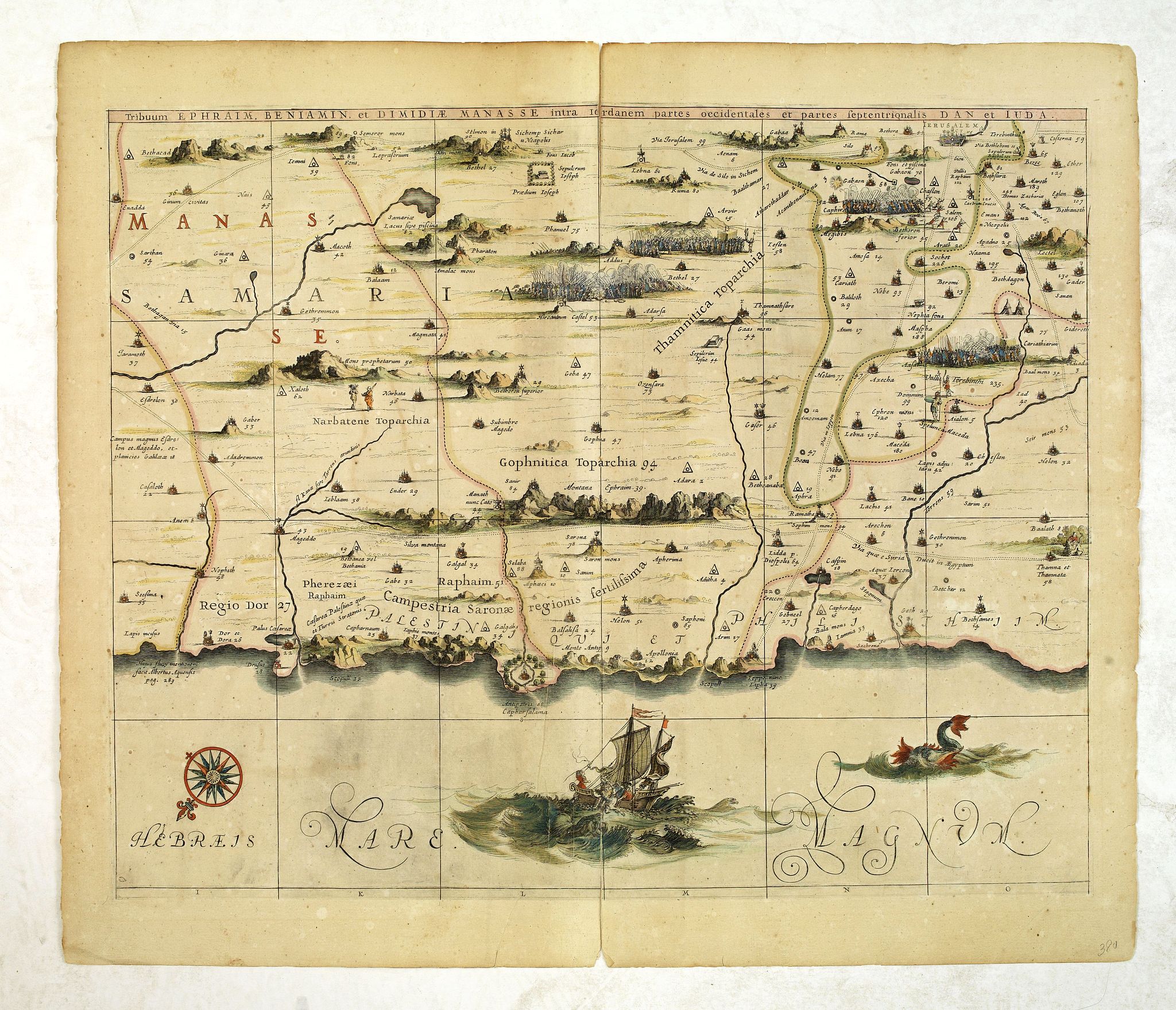 This map depicts the lands of Ephraim, Benjamin, and part of Manasseh beyond the Jordan river. Numerous Biblical illustrations include a dramatic scene where Jonas is being cast from a sailing ship into the open maw of the awaiting whale. Also shows the lands of Palestine and numerous armies.