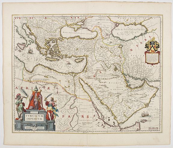 A very handsome map with a particularly fine cartouche showing the Turkish Sultan on his throne and allegorical figures at either side brandishing weapons. At the right is a smaller cartouche with a dedication by the Blaeu's. Sailing ships can be seen in the Arabian Sea and the Mediterranean. The geography is reasonably accurate for the time with many place names given. Armenia and George ( Giorgia ) are named. An impressive and attractive map.