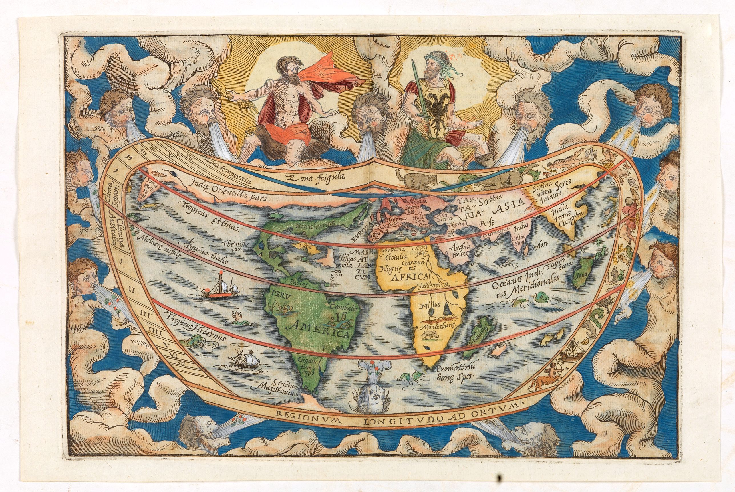 The Gemma Frisius map was believed to have been dedicated to Emperor Charles V. One of the deities at the top of the map bears the Holy Roman Emperor's Double Eagle on its breastplate.