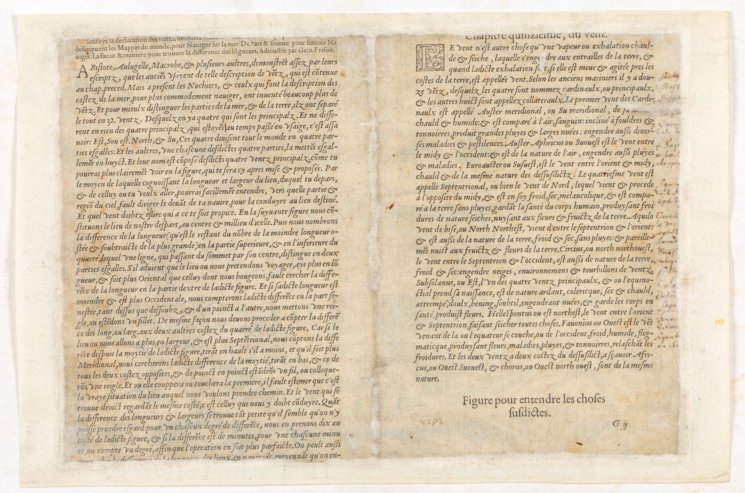 This early world map is significant in the history of the mapping of America. The continents are largely based upon Mercator's 1541 Globe Gores, although North America has shrunk to a narrow strip and has named it Baccalearium (good Cod Fishing nearby). The northwest passage is clearly identified.
