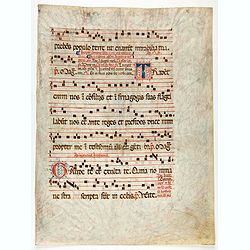 Vellum leaf with a large miniature showing saint surrounded by noble women in typical medieval dresses. |